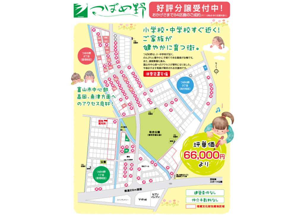 当社販売開始以来、おかげさまで84区画超のご成約(R7.12現在)。四方小学校、倉垣小学校、和合中学まで徒歩圏内。子育てに最適な環境と富山市中心部、高岡、魚津方面への良好なアクセスが自慢です。