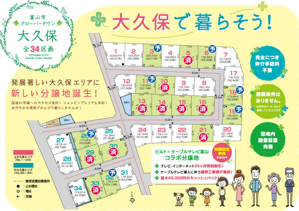 ●物件所在地/富山市上大久保字牛ケ花割1713番他4筆・富山市中大久保字東入割54番他3筆及び市有地●販売総面積/9,127.50㎡(2,761.06坪)●総区画数/34区画●今回販売区画/34区画●地目/宅地●都市計画・用途地域/市街化・第一種住居区域●建ぺい率・容積率/60%・200%●道路/団地内道路市道6.0~6.7m全面アスファルト舗装●開発許可番号/富山市指令建建指第789号(令和5年11月21日)●上・下水道/富山市営●ガス/個別プロパン●電気/北陸電力等、その他小売電気事業者●CATV/全区画引込●取引態様/●売主/富山県知事(7)第2271号●消雪装置/団地内設置●ゴミステーション/団地内に1カ所●調整池/団地内に2カ所●井戸/団地内に1カ所●情報登録日/令和6年2月20日●広告有効期限/令和7年12月末日