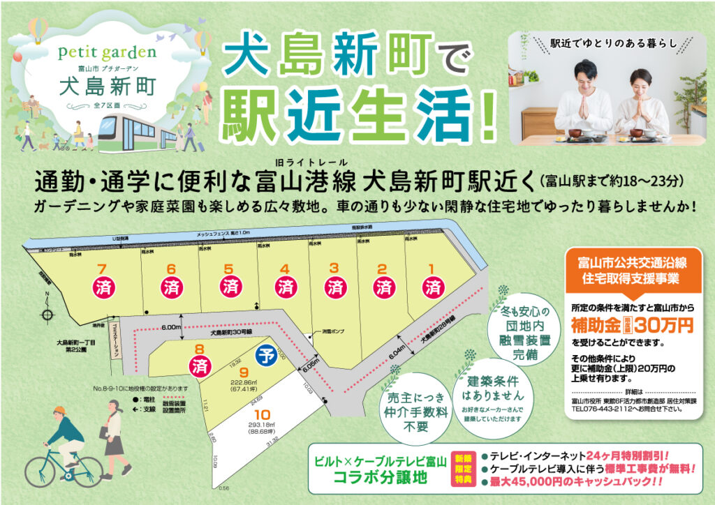 ●富山市公共交通沿線住宅取得支援事業により、所定の条件を満たすと富山市より補助金限度額30万円を受け取ることができます(詳細は富山市役所居住対策課まで)