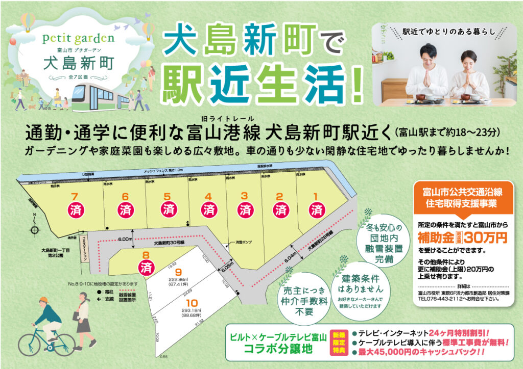 ●物件所在地/富山市犬島新町一丁目312外●販売総面積/2,451.64m2(741.62坪)●総区画数/10区画●今回販売区画数/2区画●地目/宅地●都市計画・用途地域/市街化区域・第1種中高層住居専用地域●建ぺい率・容積率/60%・200%●道路/富山市道6.00m〜6.05m●開発許可番号(No.1~7)/富山市指令5建指第1158号(R5開発037)2025年5月13日●上・下水道/富山市営●ガス/個別PG●電気/北陸電力等、その他小売電気事業者●消雪装置/既設・団地内設置●ゴミステーション/既設利用●売主:株式会社ビルト 富山県知事(7)第2271号●広告有効期限/2026年6月末日