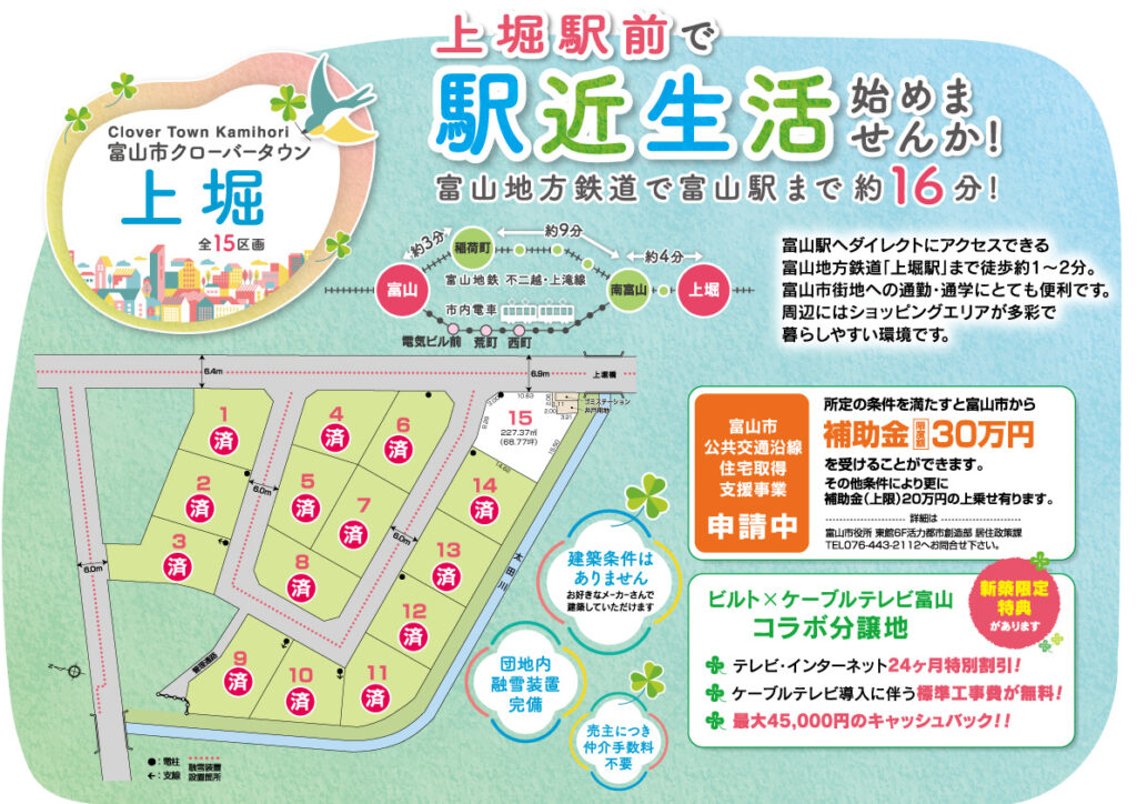 <建築協定>建築物の敷地、用途、形態、意匠、建築設備、及び緑化に関する基準を定めた富山市との協定「(仮称)クローバータウン上堀建築協定」を申請中です。
