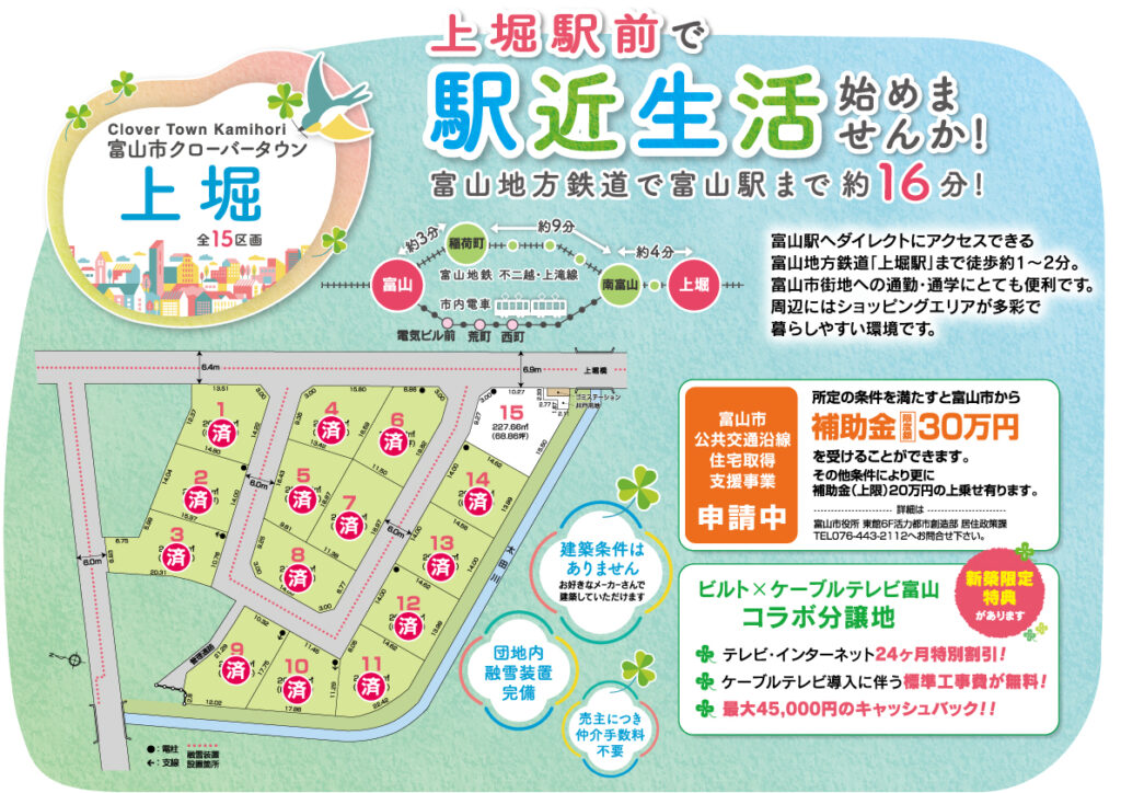 ●富山市公共交通沿線住宅取得支援事業により、所定の条件を満たすと富山市より補助金限度額30万円を受け取ることができます(詳細は富山市役所居住政策課まで)