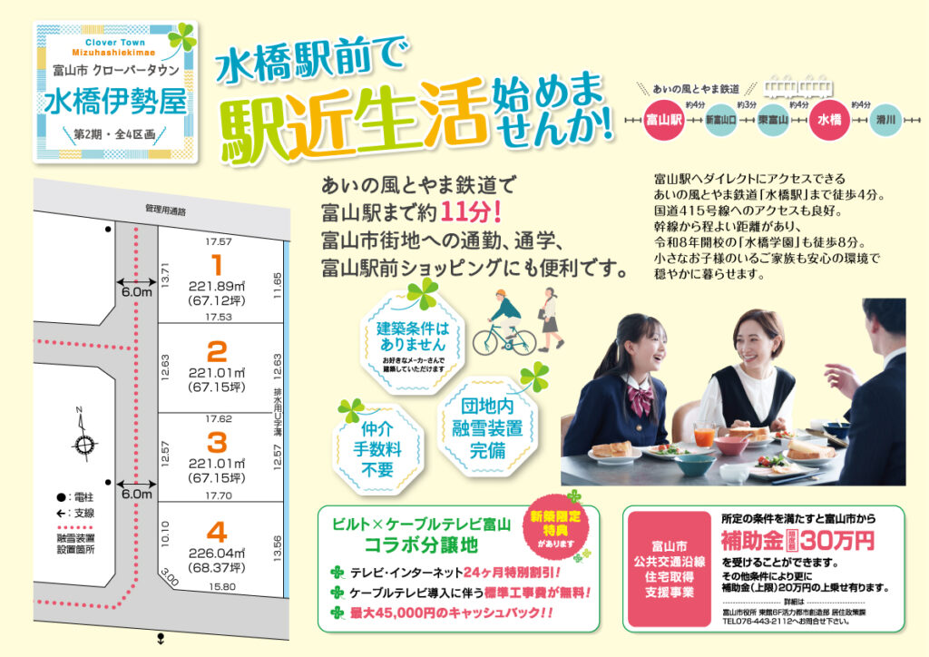 ●所在地/〒939-3515 富山市水橋伊勢屋676番22,外3筆(行政区:水橋駅前)●区画数/4区画(販売数も同数)●総面積/891.95m2(269.79坪)●交通/あいの風とやま鉄道水橋駅まで約350m(徒歩約2分)●地目/宅地●都市計画/都市計画区域内・市街化区域●用途地域/第1種住居地域●建ぺい率/60%●容積率/200%●道路/南側既存道路、団地内道路:富山市道6.0m●上下水道/富山市営●ガス/個別プロパン●電気/北陸電⼒等、その他小売電気事業者●ゴミステーション/団地内既設を利用(予定)●融雪装置/団地内完備済(同団地消雪管理組合に要加入)●取引態様/売主:株式会社ビルト 富山県知事(7)2271号●その他/富山市公共交通沿線住宅取得⽀援事業●広告有効期限/2025年12月末日