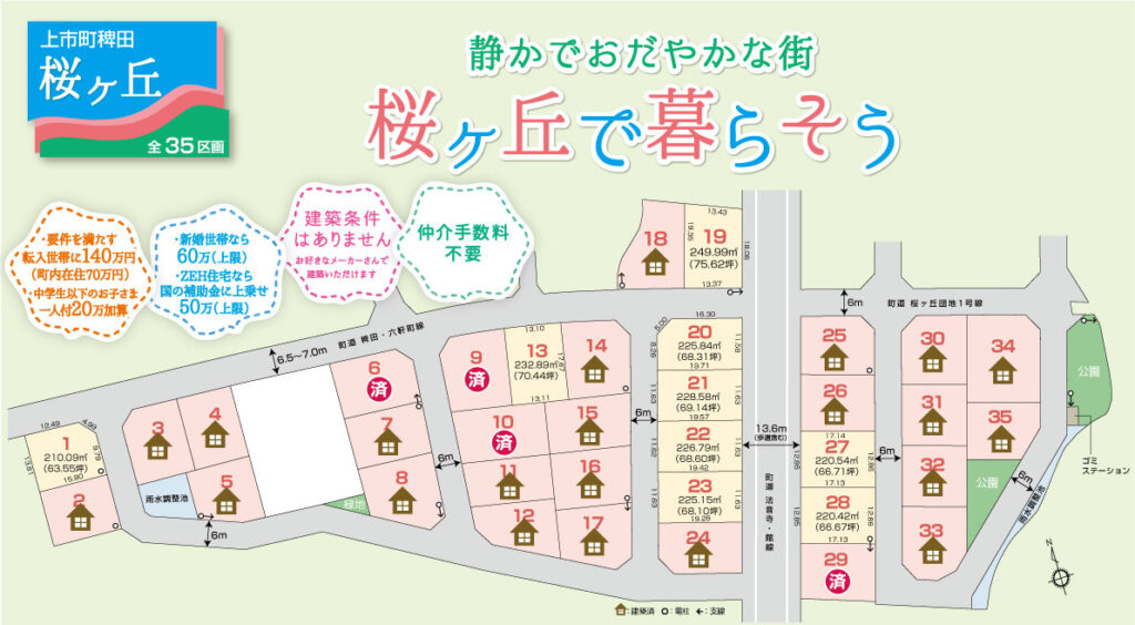 ●所在地/富山県中新川郡上市町稗田字古討免41-7外●土地開発総面積/11,324.22㎡(3,425.57坪)●総区画数/35区画●地目/宅地●用途地域/無指定●都市計画/非線引地域●建ぺい率/60%●容積率/200%●開発許可番号/富山県指令富士セ第10170号(令和2年5月25日)●道路/団地内6mアスファルト舗装(町道)●電気/北陸電力●上水道/上市町営●下水道/中新川公共下水道●ガス/個別プロパン●公園/団地内2個所●ゴミステーション/団地内1個所●消火栓/団地内2個所●ケーブルテレビ/Net3エリア内●売主/(有)フジ企画 富山県知事(8)1883号●販売提携/(株)ビルト 富山県知事(7)2271号●広告有効期限/2025年12月末日