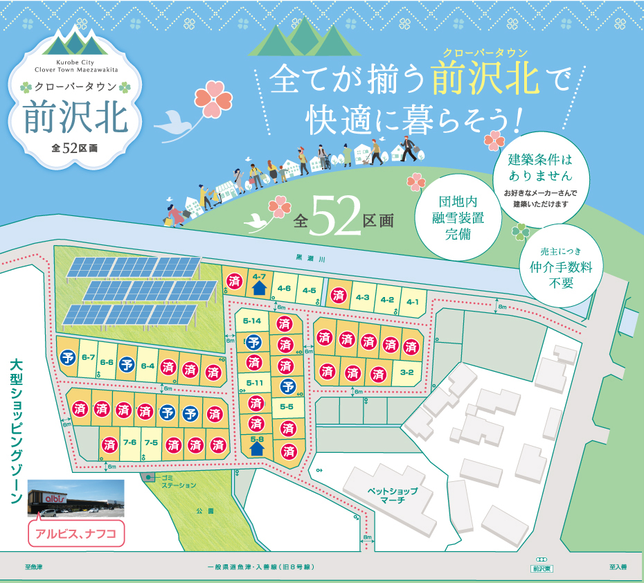 すぐお隣にアルビス、ナフコオープン!大型ショッピングゾーンに隣接する全52区画。全てが揃うクローバータウン前沢北で快適に暮らそう!小学校すぐ近く、幹線道路すぐそばで充実の交通網。暮らしやすさあふれた新しい街が誕生しました。